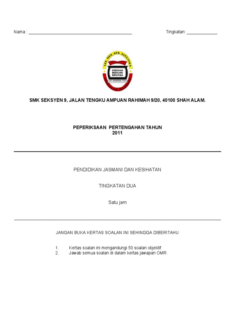 Soalan Pjk Tingkatan 2 Ujian 1 2018 Kssm Pdf